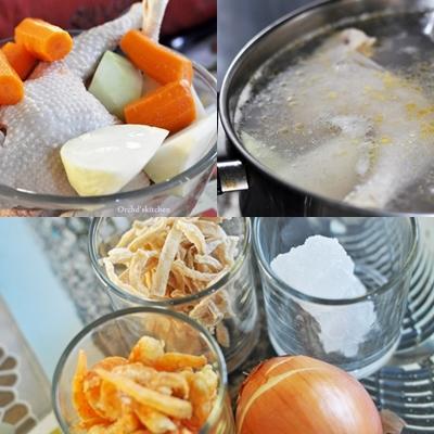 GÀ DA DÒN: Đùi gà trụng sơ nước sôi rửa sạch để ráo ,ướp vào 1/2 tsp bột nêm +muối vào để cho thấm Đặt nồi nước sôi nêm vào muối + bột nêm cho đậm đà sau đó bỏ đùi gà vào luộc cho thêm vào 1 củ hành nướng, nước luộc gà sôi khỏang 5-7phút thì tắt bếp đạy nắp nồi lại ngâm đùi gà trong nước khỏang 1g để gà thấm gia vi và tự chín,sau đó vớt ra cho ráo lau khô. Nước luộc gà này để nấu chung với nước dùng luôn. Làm gà trước để tủ lạnh cho khô ,ráo trước khi nấu nước dùng khi nào ăn thì chiên gà. Đặt chảo dầu nóng cho gà vào chiên ,vì gà đã chín nên khi chiên để lửa lớn gà sẽ mau vàng và dòn