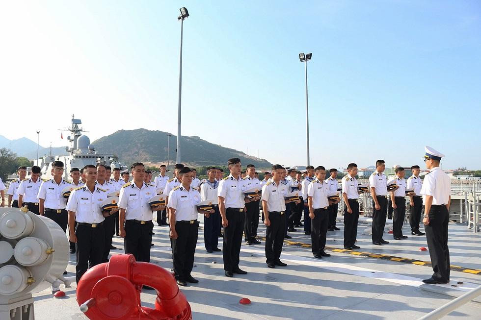 Kiểm tra lễ tiết tác phong quân nhân trên Tàu 015 Trần Hưng Đạo, Lữ đoàn 162. Ảnh: Lê Ngọc